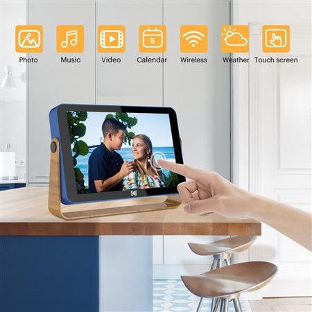 HD Wi-Fi digitale fotolijst Met een 10 "1280 x 800 IPS-touchscreen en de mogelijkheid om media van Amerikaanse flashdrives, SD-kaarten of cloudbronnen te gebruiken, is dit elektronische frame de volgende evolutie in het laten zien van thuisfoto's. Direct draadloos delen Upload foto's, video en audio via uw smartphone of tablet met behulp van de Kodak Photo Frame-app voor een gemakkelijk bij te werken mobiel fotoalbum om te delen met vrienden en familieleden, allemaal met behulp van de speciaal daarvoor gemaakte Kodak-app. Diavoorstelling met hoge resolutie IPS-technologie zorgt voor levendige kleuren en vloeiende bewegingen om snel achter elkaar over te schakelen tussen een horizontale foto, verticaal portret en film, zonder de beperkingen van een klein LCD-telefoonscherm. 8 GB intern geheugen Alle interne inhoud is gemakkelijk toegankelijk met het high-respons, edge-to-edge touchscreen-display en de oplaadbare batterij die 4-5 uur meegaat. Modern huisontwerp Dit frame doet ook dienst als klok en weerbericht zodra het is verbonden met internet, waardoor slim gebruik wordt gemaakt van muur- of tafelruimte. Andere mogelijkheden Muziek afspelen met verschillende soorten afspeelmodi Weersvoorspelling en klok, praktische functies voor het dagelijks leven Lichtsensor zorgt ervoor dat het paneel automatisch zijn helderheid aanpast aan de omgeving De klok in de nachtmodus wordt 's nachts automatisch geactiveerd nadat de lichten uit zijn, dus het is prettiger voor uw ogen om de tijd af te lezen in een donkere omgeving Ondersteunt SD / SDHC / USB-flashdrive (tot 32 GB) voor plug-and-play-compatibiliteit Automatische aan / uit-timer en verschillende opties voor alarminstellingen 10 GB gratis cloudopslag gedurende vijf jaar Vooraf ingestelde achtergrondmuziek kan vanaf het frame worden afgespeeld met instelbaar volume